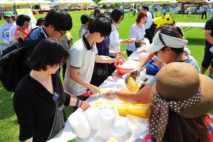 지난 5월30일 경기 여주시 금사면 금사근린공원에서 여주명품 금싸라기 참외의 브랜드 가치 제고 및 지역 농가소득 증대로 지역경제 활성화를 위한 '금사참외축제'가 열렸다. 사진은 이날 축제 현장을 방문한 관광객들이 참외를 시식하고 있는 모습.(사진제공=여주시청)