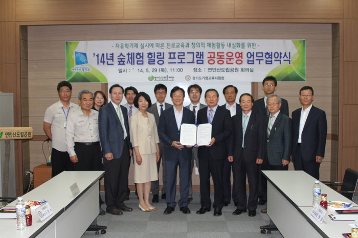 경기 가평교육지원청은 최근 연인산 도립공원 관리단 회의실에서 자유 학기제 실시에 따른 진로교육과 창의적 체험활동의 내실화를 지원하기 위해 경기농림진흥재단과 업무협약을 체결했다. 사진은 이날 협약식에 참석한 황중원 교육장과 김정한 경기농림진흥재단 대표이사를 비롯한 관계자들의 모습.
