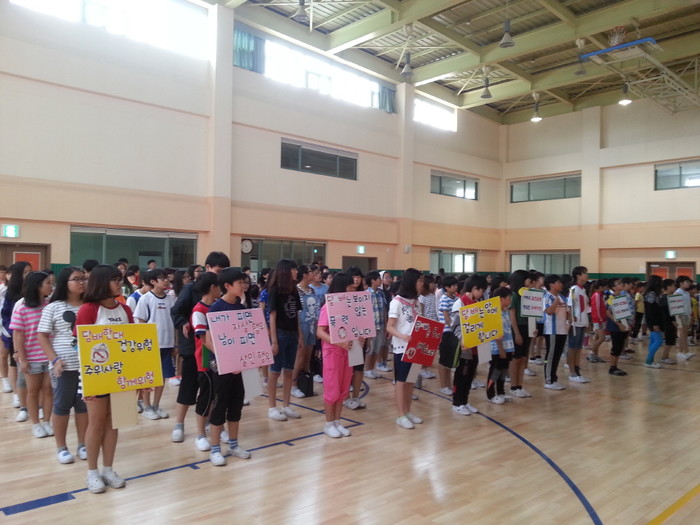 지난 5월30일 충남 아산시 사동초등학교는 세계금연의 날을 맞아 초등학교 고학년인 4~6학년 학생과 교직원이 함께 초등학교 체육관에 모여 '2014년도 흡연예방교육 선도학교 선포식 및 금연 결의대회'를 실시했다. 사진은 이날 금연 관련 피켓을 들고 체육관에서 모인 학생들의 모습. (사진제공=아산교육지원청)