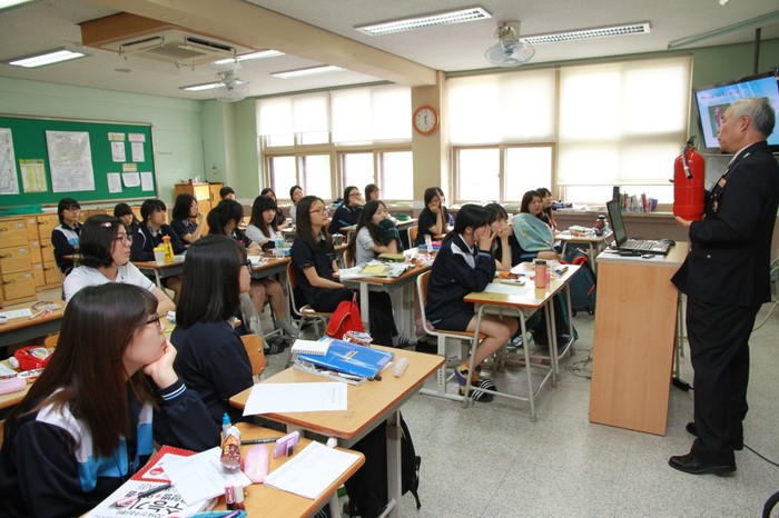 서울 구로소방서는 지난 5일 경기 부천시 원미구에 위치한 부천여자고등학교에서 1학년 학생들을 대상으로 진행된 '2014 전문 직업인과의 만남' 멘토 프로그램에 참여해 '119가 달려갑니다!'라는 주제로 소방관을 꿈꾸는 고등학생들에게 진로결정 방향 제시와 필요한 조언을 건네는 시간을 보냈다. (사진제공=구로소방서)