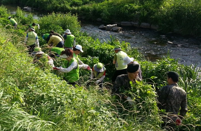 최근 서울 은평구 응암3동 주민자치위원회는 주민센터 직원, 통장 및 응암노인복지관 생태보존팀과 함께 불광천변에 자생하는 위해 외래식물인 환삼덩굴을 제거하는 ‘불광천 유해식물 제거작업 자원봉사활동’을 실시했다. 사진은 불광천 주변의 유해식물을 제거하는 사람들의 모습. (사진제공=은평구청)