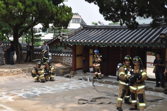 최근 인천 계양소방서가 부평향교에서 중요 목조문화재의 지리적·구조적 특성 등을 고려한 시스템 구축 및 자위소방대 능력 제고로 화재진압 대응역량 강화를 위한 문화재 합동 소방훈련을 실시했다. 사진은 부평향교에서 화재진압 훈련을 하는 대원들의 모습. (사진제공=인천계양소방서)
