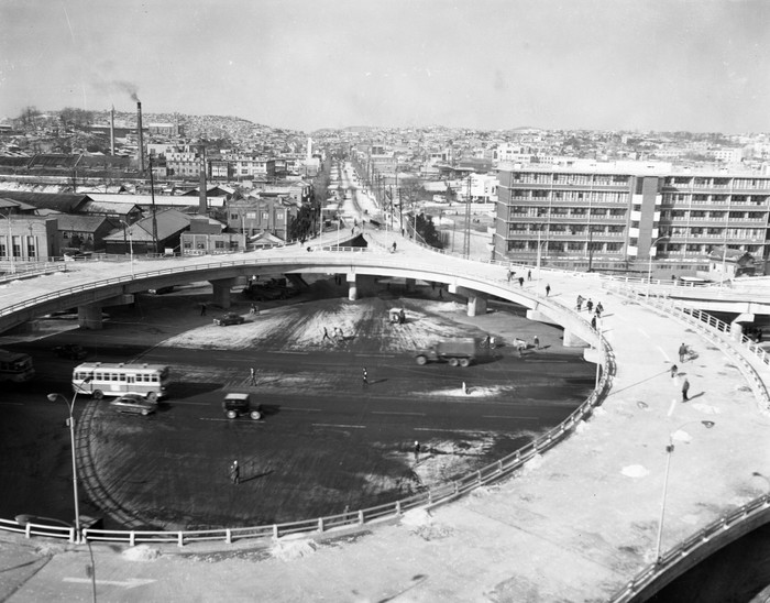 | ▲ 1967년 개통된 우리나라 최초의 입체 교차 시설인 '삼각지 입체교차로'의 모습. 이 교차로는 1994년 12월에 철거됐다. | ||