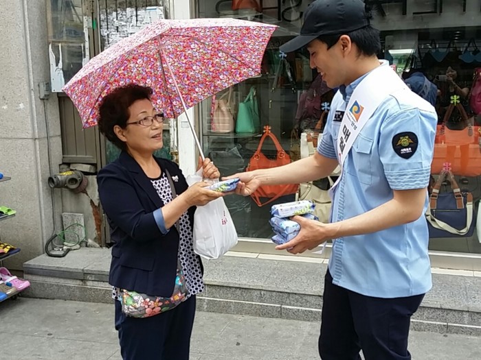 경기 안성시는 지난 5일 안성시내와 중앙시장에서 관련 유관기관 및 단체, 사회복무 요원과 함께 '여름철 대비 호우·안전사고 예방'이란 주제로 '안전점검의 날' 캠페인을 실시했다. 사진은 시민에게 홍보물을 전달하는 사회복무요원의 모습. (사진제공=안성시청)