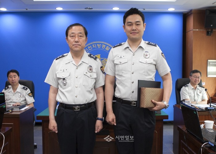 최근 인천 중부경찰서 하인천지구대 소속 경찰관 2명이 순찰근무 중 대형화재로 이어질 수 있었던 사고를 막고 인명을 구조해 타 경찰관들의 모범이 되고 있다. 사진은 공로에 대한 박수를 받고 있는 노호일 경위(왼쪽)와 방순원 경장의 모습.(사진제공=중부경찰서)