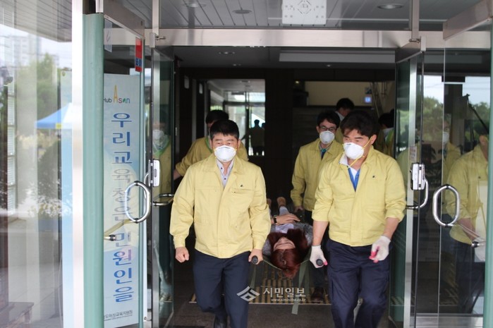 충남 아산교육지원청은 9일 전직원이 참여한 가운데 아산소방서와 연계해 화재발생 상황을 가정해 신속하고 적절한 조기대응을 위한 '2014년 합동 소방훈련'을 실시했다. 사진은 부상자 구호 훈련을 실시하고 있는 소방훈련 참가자들의 모습. (사진제공=아산교육지원청)