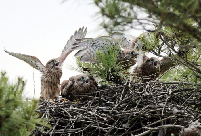 올해 초 전남 강진군 병영면사무소 광장 소나무에 만들어진 까치둥지를 차지하고 부화된 천연기념물 제323호 황조롱이 새끼들이 지난 8일 오전 어미의 보호 속에 먹이를 차지하기 위해 애를 쓰고 있다.