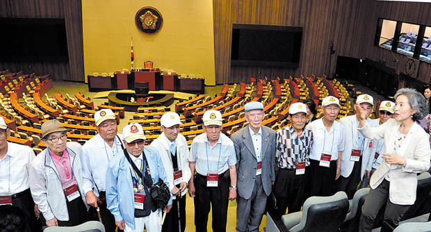 9일 오전 탈북 국군포로 어르신들 20여명과 가족들이 탈북 후 처음으로 사단법인 물망초 후원으로 서울 여의도 국회 본회의장을 참관 박선영 물망초 재단 박선영 이사장의 설명을 경청하고 있다.