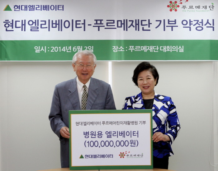 이날 현대엘리베이터는 푸르메재단과 기부 약정을 체결하고 2015년 준공 예정인 푸르메어린이재활병원(서울 마포구 상암동)에 설치될 병원용 엘리베이터를 기부하기로 했다.