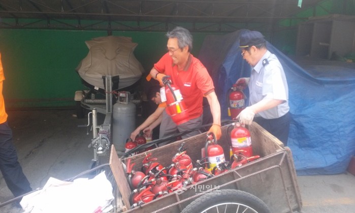 지난 9일 인천광역시 인천공단소방서 고잔119안전센터가 인근 산업용품상가 단지에서 파열사고 발생 우려가 있는 노후소화기 35개를 무료로 수거해 폐기 처분했다. 사진은 이날 수거한 노후소화기를 폐기 처분하고 있는 관계자들의 모습.(사진제공=인천광역시)