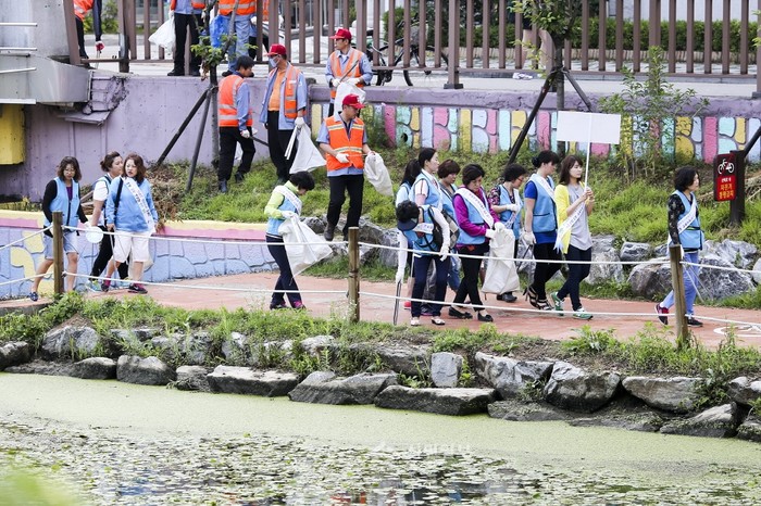 11일 인천시 계양구가 인천아시아경기대회와 장애인아시아경기대회 등 인천에서 개최되는 국제 대회에 대한 지역주민의 관심을 확산시키고 대회의 성공적인 개최를 위해 범구민 클린업데이를 추진하고 있다. 사진은 이날 서부간선수로 주변을 걸으며 쓰레기를 수거하고 있는 주민들의 모습. (사진제공=계양구청)