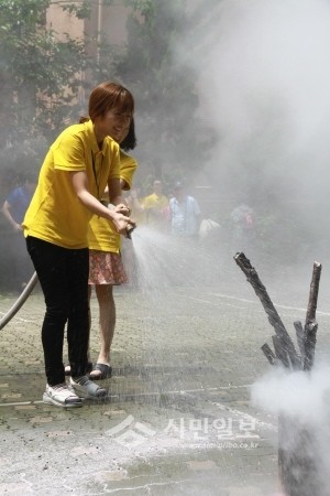 서울 구로소방서는 11일 금천구 시흥대로51길에 위치한 금천노인종합복지관에서 사회복지사 및 노인 등 100여명을 대상으로 '찾아가는 화재예방 안전교육'을 실시했다. 사진은 초기화재 진압방법을 실습 중인 참가자들의 모습. (사진제공=구로소방서)