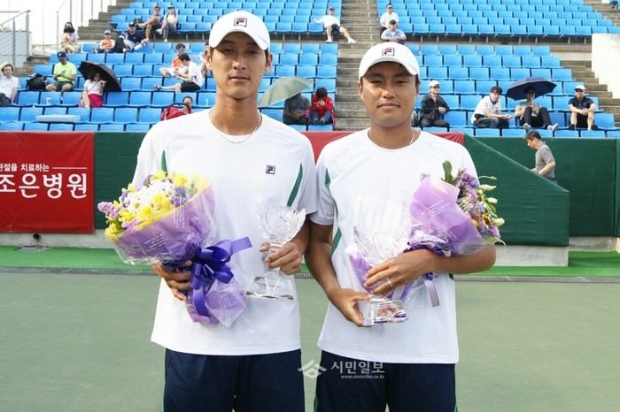 경기 안성시는 지난 8일 성료한 '2014 대구국제남자퓨처스 테니스 대회'에 참가해 김청의 선수가 남자 단식 우승을, 임형찬·김유섭 선수가 복식 우승을 차지했다. 사진은 복식 우승을 차지한 안성시청 소속 임형찬·김유섭 선수의 모습. (사진제공=안성시청)