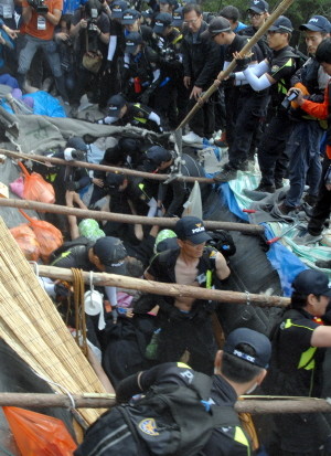 11일 오전 경남 밀양시 부북면 위양리 평밭마을 129번 송전탑 공사 현장에서 밀양시청 공무원들이 움막철거 행정대집행을 진행하는 가운데 움막 주변의 구덩이를 경찰이 철거하고 있다.