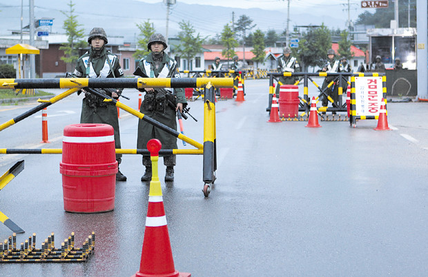 1일 동부전선 최전방에서 육군 임 모 병장이 동료들에게 수류탄을 던지고 총기를 난사해 5명이 숨지고 7명이 다친 사고가 발생한 22일 새벽 강원 고성군 간성읍 대대삼거리 검문소에서 장병들이 경계 근무를 서고 있다.