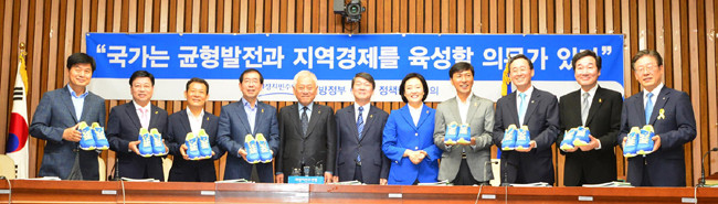 22일 오전 민생과 안전, 균형발전을 위한 새정치민주연합 지방정부예산정책협의회의가 열린 서울 여의도 국회 245호실에서 김한길·안철수 공동대표는 6.4지방선거 시·도지사 당선인들에게 발로 뛰라는 의미로 운동화를 선물했다. 이춘희(왼쪽부터) 세종시장, 권선택 대전시장, 윤장현 광주시장, 박원순 서울시장 당선자, 김한길·안철수 공동대표, 박영선 원내대표, 안희정 충남지사, 송하진 전북지사, 이낙연 전남지사, 이재명 성남시장 당선자.