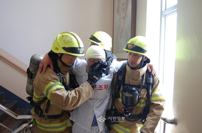 경기 안성소방서는 지난 27일 안성시 죽산면에 위치한 파라밀 요양병원에서 소방대원 32명, 파라밀 요양병원 자위소방대 30명이 참가한 가운데 광역 3호 훈련을 실시했다. 사진은 이날 원인미상의 화재가 발생한 상황을 가정하고 인명구조 훈련을 실시하고 있는 소방대원들의 모습. (사진제공=안성소방서)