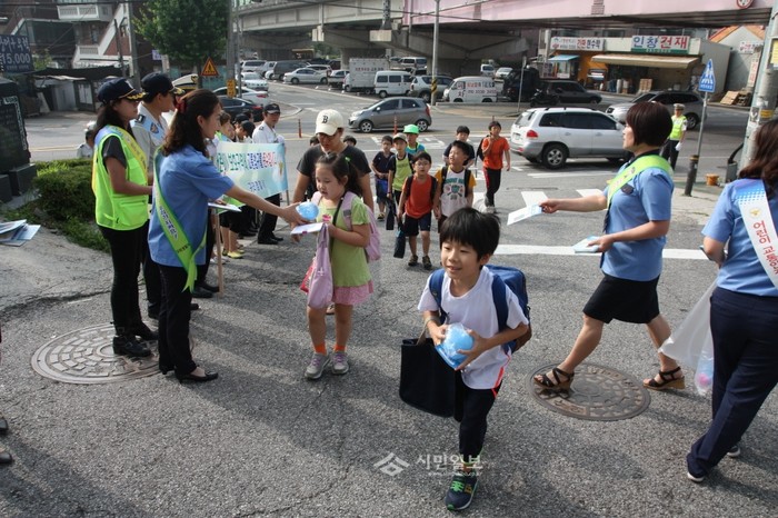 지난 26일 오전 8시 경기 구리경찰서가 지역내 인창초등학교 통학로에서 경찰서장, 모범운전자회, 녹색어머니회 등 70여명과 함께 통학하는 어린이들과 인근 도로의 운전자들을 상대로 우산, 저금통 등의 홍보물을 배포하며 교통사고 예방 홍보 캠페인을 실시했다. 사진은 어린이들에게 홍보물을 나눠주는 참여자들의 모습. (사진제공=구리경찰서)
