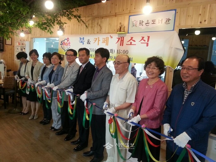 최근 경기 안양시 호계1동 주민센터 2층에 3000여권의 책을 갖춘 작은도서관과 카페로 구성된 '북&카페'가 문을 열었다. 이 카페에서 나오는 수익금은 지역내 어려운 이웃을 돕기 위한 기금으로 활용될 예정이다. 사진은 이 날 열린 개소식에 참여한 관계자들과 지역 주민들의 모습.(사진제공=안양시청)