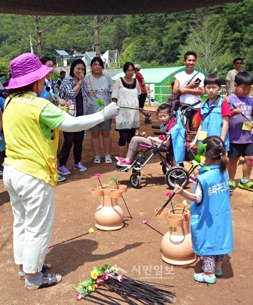 지난 6월28일 서울 송파구 드림스타트가 경기 양평 치즈마을에서 '가족행복여행 프로그램'을 개최해 드림스타트 13가족과 함께 치즈와 피자를 만들고, 계곡에서 물놀이를 즐기는 등 다양한 야외활동을 진행했다. 사진은 투호 체험에 참여하고 있는 가족들의 모습.(사진제공=송파구청)