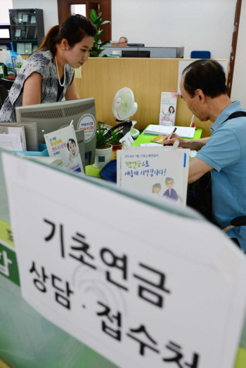 65세 이상 노인에게 매월 최고 20만원 이상을 지급하는 기초연금법이 발효된 1일 오후 서울 성동구 성수1가1동 주민센터를 찾은 노인들이 기초연금 신청을 하고 있다. 기초연금은 노인 639만명 가운데 447만여 명이 받으며, 이 중 '기초노령연금'을 받아온 420만명은 별도로 신청하지 않아도 된다. 기초노령연금을 한 차례도 신청한 적 없거나 다음달 만 65세가 되는 노인은 신분증과 통장사본을 갖고 읍, 면사무소 또는 동 주민센터, 국민연금공단지사 등을 방문해 신청할 수 있다.