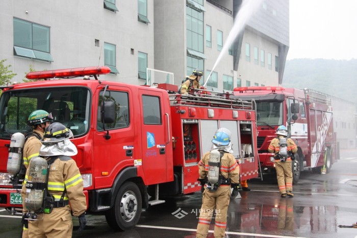 경기 하남소방서는 2일 청사내에서 경찰관 및 소방 관계자 100여명이 참여한 가운데 시민의 생명과 재산 보호를 위해 하남경찰서·하남소방서 합동으로 '모의 소방훈련'을 실시했다. 사진은 진압훈련을 실시하고 있는 소방대원들의 모습. (사진제공=하남소방서)