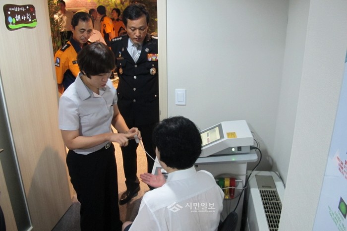 3일 경기 군포소방서가 소방공무원 외상후스트레스장애(PTSD)를 해소하기 위한 자가 심리치유실인 '다솜터(옛 사랑의 준말)' 개관 행사를 했다. 사진은 총 4개의 힐링 테마로 구성된 다솜터실 중 스트레스 측정 및 상담을 할 수 있는 '해아림'실에 대한 설명을 듣고 있는 공무원들의 모습. (사진제공=군포소방서)