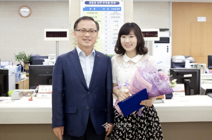 경북 구미시 시민만족과는 지난 2일 시청 민원실에서 직원들과 민원인들이 참석한 가운데 기업민원계 김효진씨를 '2014년 2분기 스마일왕'으로 선정해 2분기 스마일왕 증서를 전달하고 축하행사를 열었다. 사진은 최종원 부시장(왼쪽)과 스마일왕으로 선정된 김씨(오른쪽)의 모습. (사진제공=구미시청)
