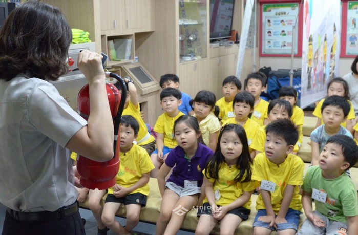 서울 영등포소방서는 3일 소방서 4층 안전체험교육관에서 선유동2로에 위치한 평화유치원 원생 30명을 대상으로 소화기 사용법, 화재발생시 대피요령 등 어린이 소방안전교육을 실시했다. 사진은 소화기 사용법을 배우고 있는 아이들의 모습. (사진제공=영등포소방서)