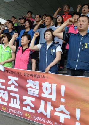 전국교직원노동조합 경기지부 등 경기지역 시민·사회단체 30여개로 구성된 '민주주의 사수, 전교조 탄압 저지 경기공동대책위원회' 회원 30여명은 3일 오전 경기도교육청 현관 앞에서 기자회견을 열고 '전교조 법외노조 통보는 박근혜 정권의 탄압'이라며 법외노조 통보 철회, 교원노조법 개정 등을 촉구하고 있다.
