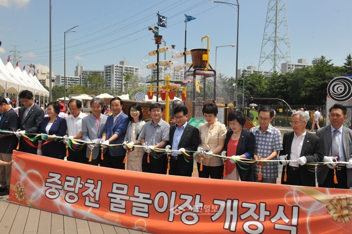 서울 노원구가 지난 4일 오전 11시 중랑천 공원 야외 수영장에서 '야외수영장 개장식'을 했다. 사진은 행사에 참석한 김성환 노원구청장(오른쪽에서 일곱번째)과 내빈들이 함께 수영장 개장을 축하하는 의미로 테이프 커팅식을 진행하고 있는 모습. (사진제공=노원구청)