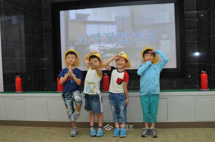 서울 은평소방서는 최근 시민안전체험교실에서 불광동 새보람유치원 지도교사 및 원생 30여명을 대상으로 화재예방 소방안전교육을 실시하였다. 이날 교육은 진도 7도의 지진체험장에서 지진발생시 행동요령과 대피방법, 소화기 화재진압체험, 열·연기 피난체험을 진행했다. 사진은 소화기 화재진압체험에서 화제진압에 성공한 아이들.(사진제공=은평소방서)