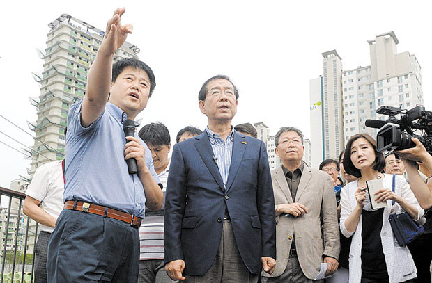 박원순 서울시장이 5일 오후 서울 송파구 장지동 위례신도시에서 재선 후 첫 현장시장실을 열고 기반시설 문제 등 지역현안 설명을 듣고 있다.