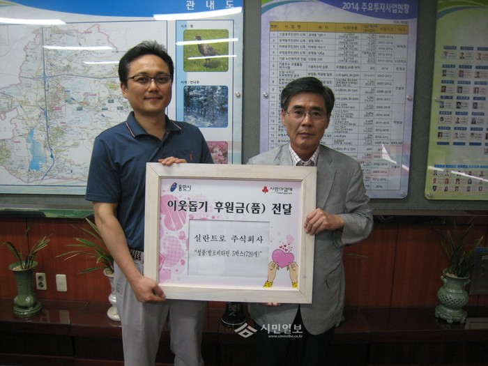 7일 경기 용인시에 위치한 실란트로 주식회사가 지역내 저소득 주민들이 무더운 여름을 건강하게 지내도록 돕기 위해 1150만원 상당의 발포비타민을 용인시 기흥구청에 전달했다. 사진은 전달식에 참여한 박주원 실란트로 투식회사 대표와 김도년 용인시 기흥구청장의 모습. (사진제공=용인시청)