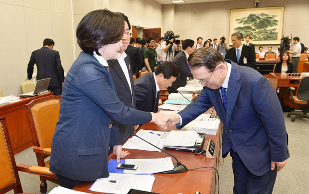 7일 오전 서울 여의도 국회에서 열린 운영위원회 전체회의에서 청와대 민정수석 출석여부 등 논의를 위해 회의가 정회된 후 김기춘(오른쪽) 대통령비서실장이 새정치민주연합 박영선 원내대표와 악수를 하고 있다.