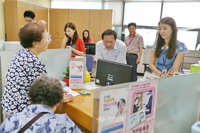 지난 7일 서울 금천구의 차성수 구청장이 취임을 맞아 지역 곳곳을 살피고 주민들의 의견을 듣기 위해 가산동을 방문, '주민과 함께하는 구청장실'을 열었다. 이 행사는 이달 총 11곳에서 열릴 예정이다. 사진은 현장에서 주민들을 상대로 민원상담 중인 차 구청장의 모습.(사진제공=금천구청)