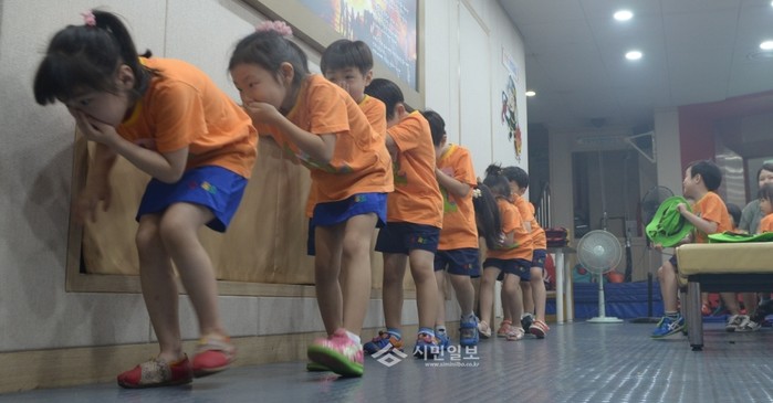 8일 오전 서울 영등포소방서가 소방서 4층 안전체험교육관에서 지역내 현대어린이집 원아들을 대상으로 ▲119신고방법 ▲연기발생시 대피방법 ▲화재시 행동요령 ▲물소화기 실습 등의 어린이 소방안전교육을 실시했다. 사진은 연기발생시 대피방법을 직접 체험해보는 어린이들의 모습. (사진제공=영등포소방서)