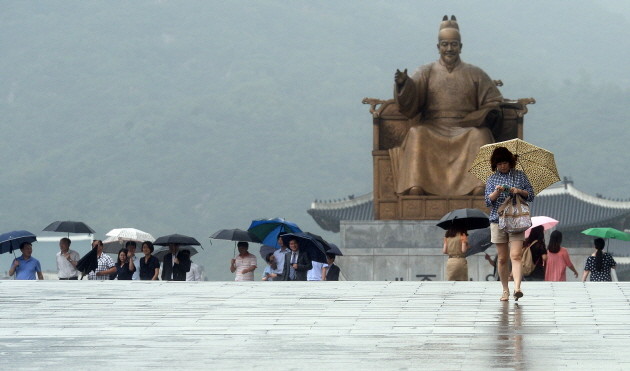 태풍의 간접 영향으로 전국 곳곳에 비가 내리고 있는 8일 오전 서울 광화문광장에서 시민들이 우산을 쓰고 발걸음을 옮기고 있다.