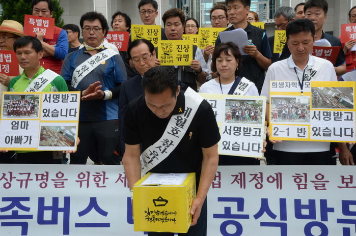 세월호 참사와 관련, 철저한 진상규명과 안전한 국가건설을 위한 특별법 제정 촉구를 위해 지난 2일부터 전국을 순회하고 있는 `세월호 가족버스`가 8일 오전 대전시청 북문 앞에서 기자회견을 열고 유가족 대표 김종기씨(50)가 서명 전달식을 마치고 인사를 하고 있다.