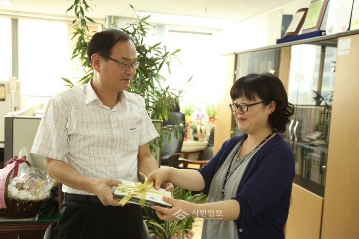 서울 구로구가 최근 민선6기의 시작과 함께 승진·전보 등이 많아져 기존의 화분, 방석과 같은 천편일률적인 선물을 탈피해 받는 사람에게도 의미있고 주는 사람에게도 부담이 적은 책을 선물하는 '내 책을 받아줘' 운동을 실시 중이다. 사진은 지난 8일 이 운동의 일환으로 책을 선물받은 장동석 구로구 위생과 과장(왼쪽)의 모습. (사진제공=구로구청)