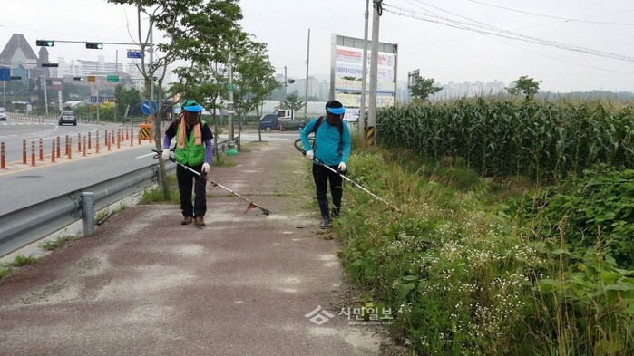 지난 8일 경기 이천시 증포동 새마을남여지도자협의회는 회원 60여명이 4개조를 구성해 섭천대로~증신로~구만리로 등 총 18km 도로변을 대상으로 제초작업 및 화단정리를 실시했다. 사진은 제초작업 중인 새마을지도자협의회 회원의 모습. (사진제공=이천시청)