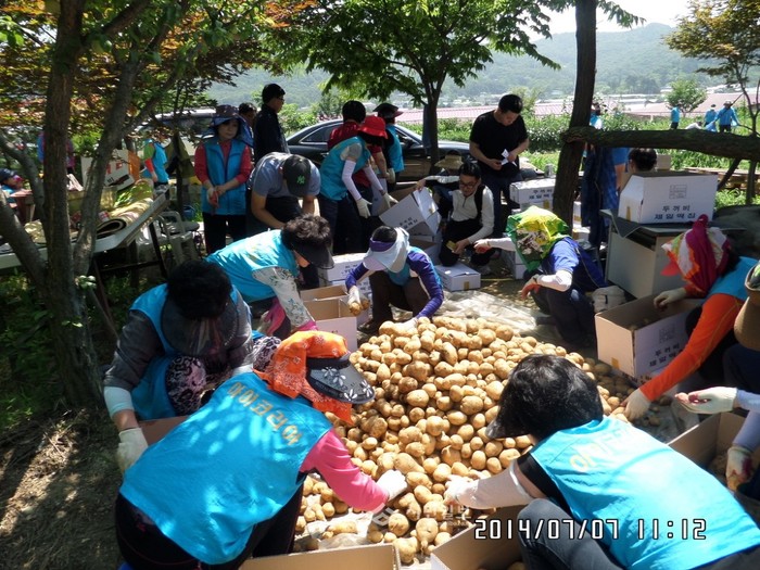 지난 7일 경기 하남시 아이코리아가 다문화가정 여성, 공직자부인회원, 예비군 지역동대장 등 80여명과 함께 항동 텃밭에서 수확한 감자 120박스(5kg)를 지역아동센터와 푸드뱅크, 장애인작업장 등에 전달했다. 사진은 이날 캔 감자를 선별하고 있는 관계자들의 모습. (사진제공=하남시청)
