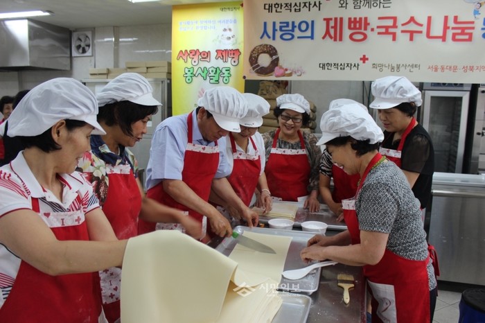 지난 8일 서울 성북구 길음1동 대한적십자봉사회 회원들과 동 주민센터 직원들이 지역내 홀몸노인과 경로당에 전달할 국수를 직접 만들어 전달하는 따뜻한 나눔봉사를 실천했다. 회원들과 주민센터 직원들은 함께 모여 밀가루 반죽을 하고 국수를 뽑아 120인분을 포장했으며 길음1동 어르신경로당 2곳, 희망풍차결연 10가구, 마니또결연 20여가구 등에 직접 방문 전달했다. (사진제공=성북구청)