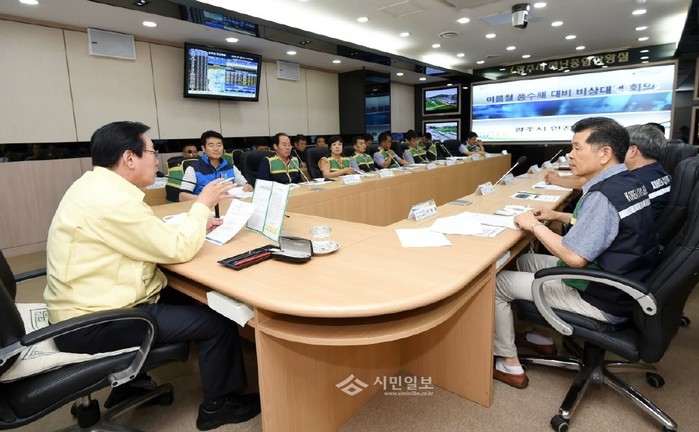 경기 광주시는 태풍 너구리 북상에 따른 간접영향권에 든 가운데 인명 및 재산피해 예방을 위해 불시에 비상대비 재난 관련 유관단체를 소집, 비상대책회의를 지난 9일 오후 재난대책 상황실에서 개최했다. 회의에서는 시와 유관기관의 풍수해 대비 추진사항에 대한 설명과 재난 예방활동 전개 등의 활동방안과 기관·단체별 상호 협력방안을 토론했다. (사진제공=광주시청)