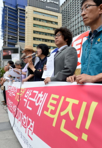 10일 오전 서울 광화문 이순신장군 동상 앞에서 열린 '전교조 설립취소 규탄 및 박근혜 퇴진 시민 학부모 선언 기자회견'에서 김경자 민주노총 부위원장이 발언하고 있다.