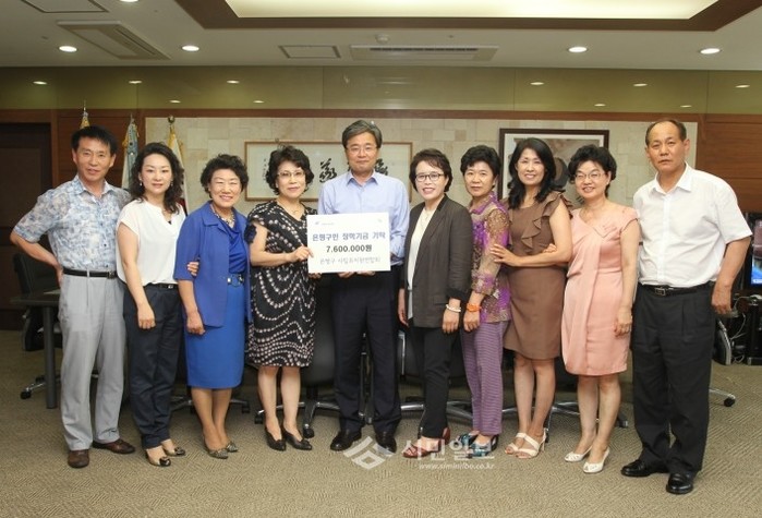 최근 은평구 사립유치원연합회가 은평구민장학재단에 지역내 38개 사립유치원에서 20만원씩 모은 돈 총 760만원을 장학금으로 기탁했다. 장학금 전달식에는 김우영 은평구청장을 비롯, 은평구 사립유치원연합회 회장 백금옥 궁전유치원장과 연합회 간사 7명이 참석했다. (사진제공=은평구청)