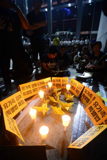 12일 오후 서울 여의도 국회 본청 앞에서 세월호가족대책위가 세월호 특별법 제정과 관련한 TFT에 가족대책위를 포함하는 3자 협의체 구성과 조원진 새누리당 간사의 배제를 요구하는 연좌 농성을 하며 촛불을 켜고 있다.