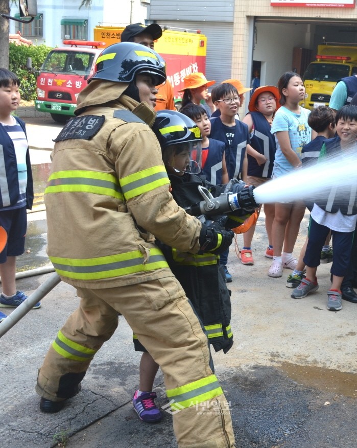 14일 인천 남동소방서가 지역내 119 소년단원들의 위험대처 능력 향상을 위해 ▲열·연기 피난체험 ▲수직구조대 피난체험 ▲진압장구 착용 및 방수체험 등의 소방안전교육을 실시해 긴급상황이 발생했을 때 대처능력을 키웠다. 사진은 소방관과 함께 화재진압용 호스 사용법을 체험 중인 119 소년단원의 모습.(사진제공=남동소방서)