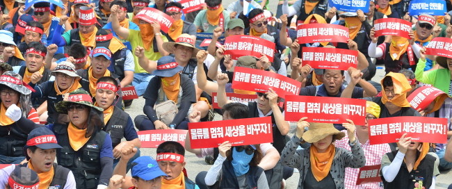14일 오전 경기 의왕ICD 앞에서 열린 화물연대 7.14 하루 경고파업 승리결의대회에서 참가자들이 구호를 외치고 있다.
