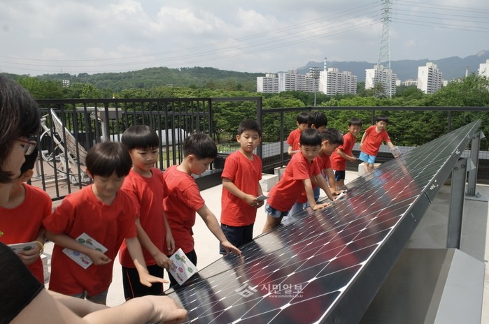 | ▲ 노원에코센터를 찾은 학생들이 옥상에 설치된 태양광 발전시설을 구경하고 있는 모습.(사진제공=노원에코센터) | ||